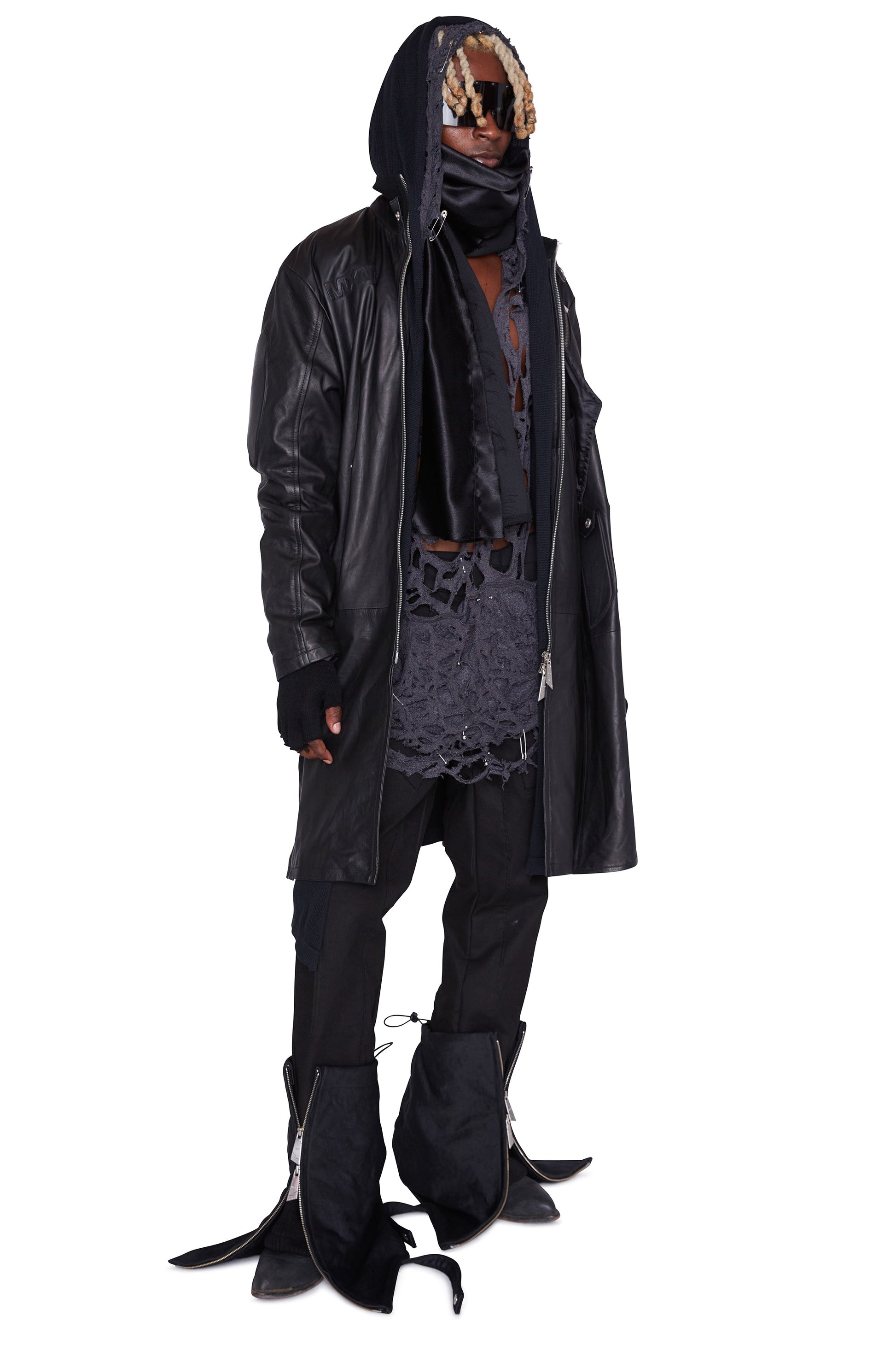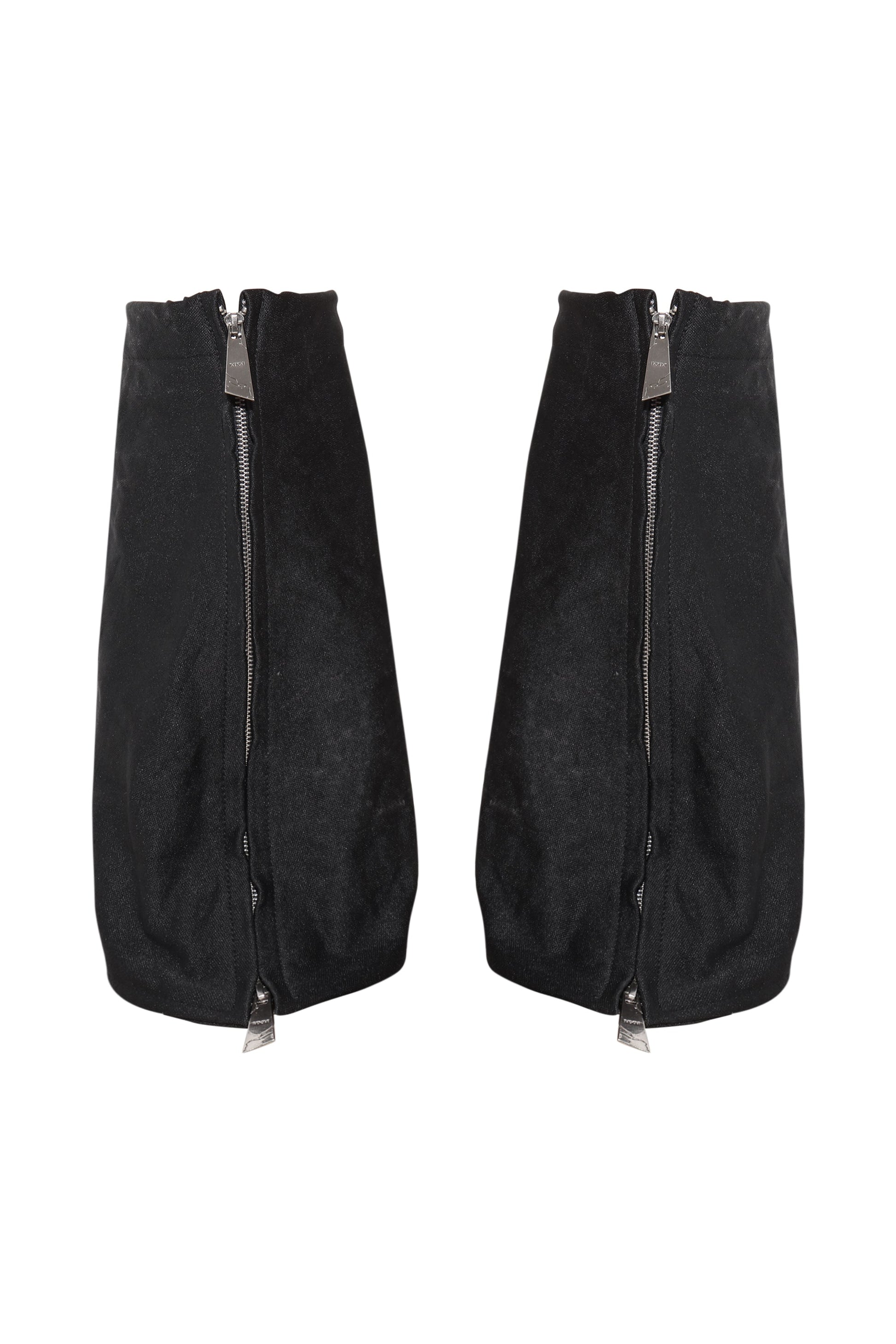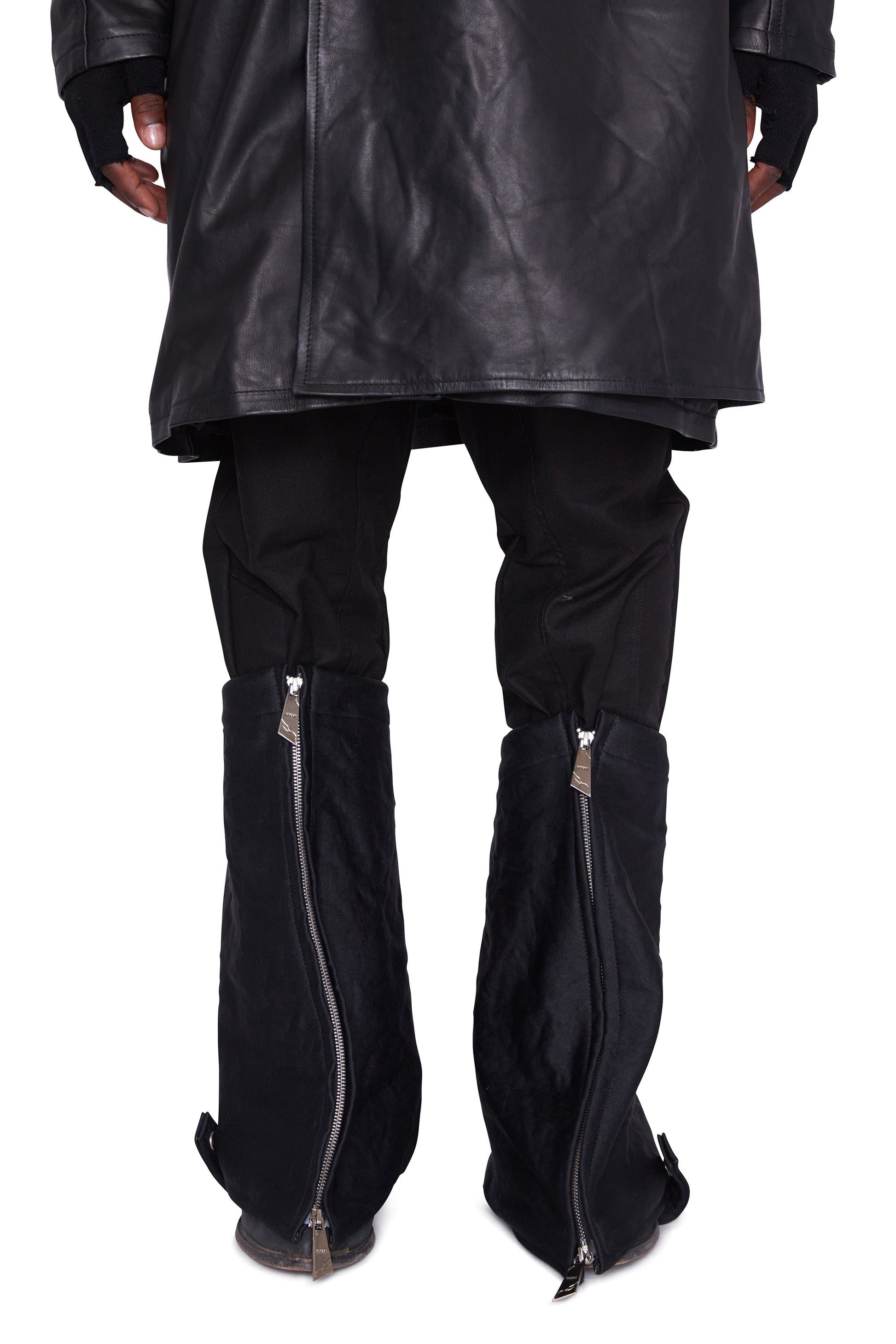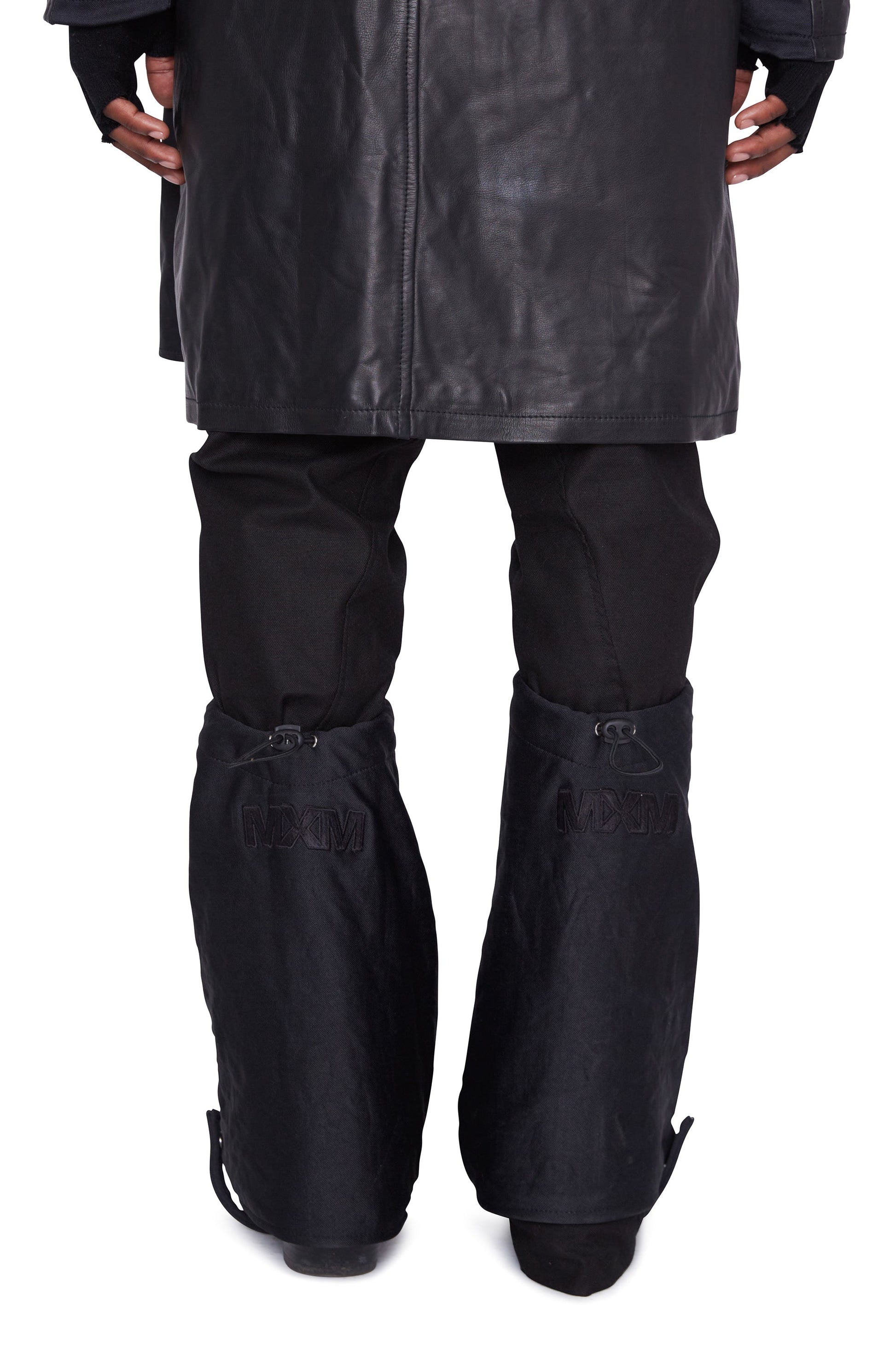 X: Schwerer, doppellagiger Stiefelüberzug aus Canvas-Baumwolle mit Zwei-Wege-Reißverschluss, Stickdetails und Paracord-Verschluss auf der Rückseite zum verstellbaren Festziehen am Bein.