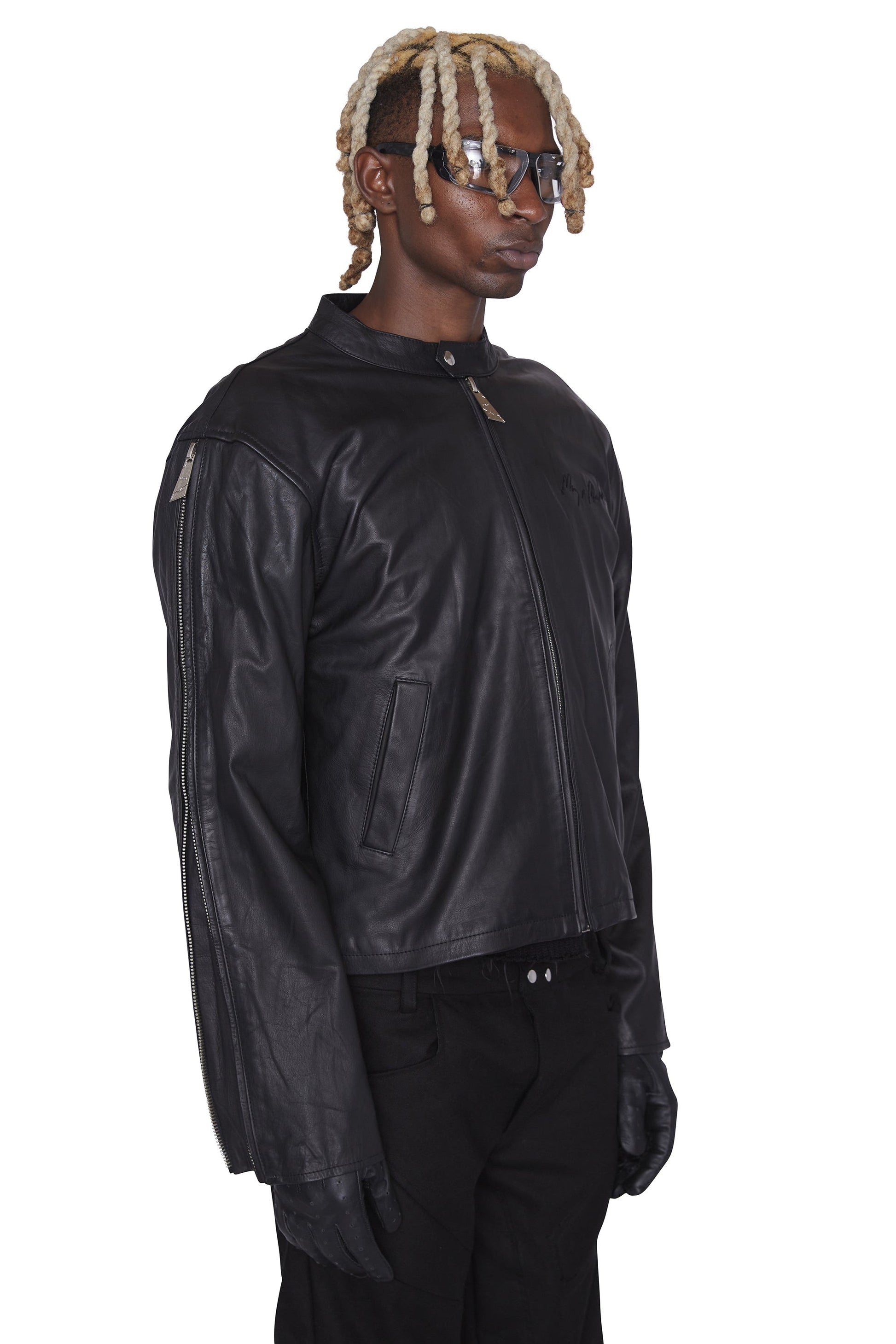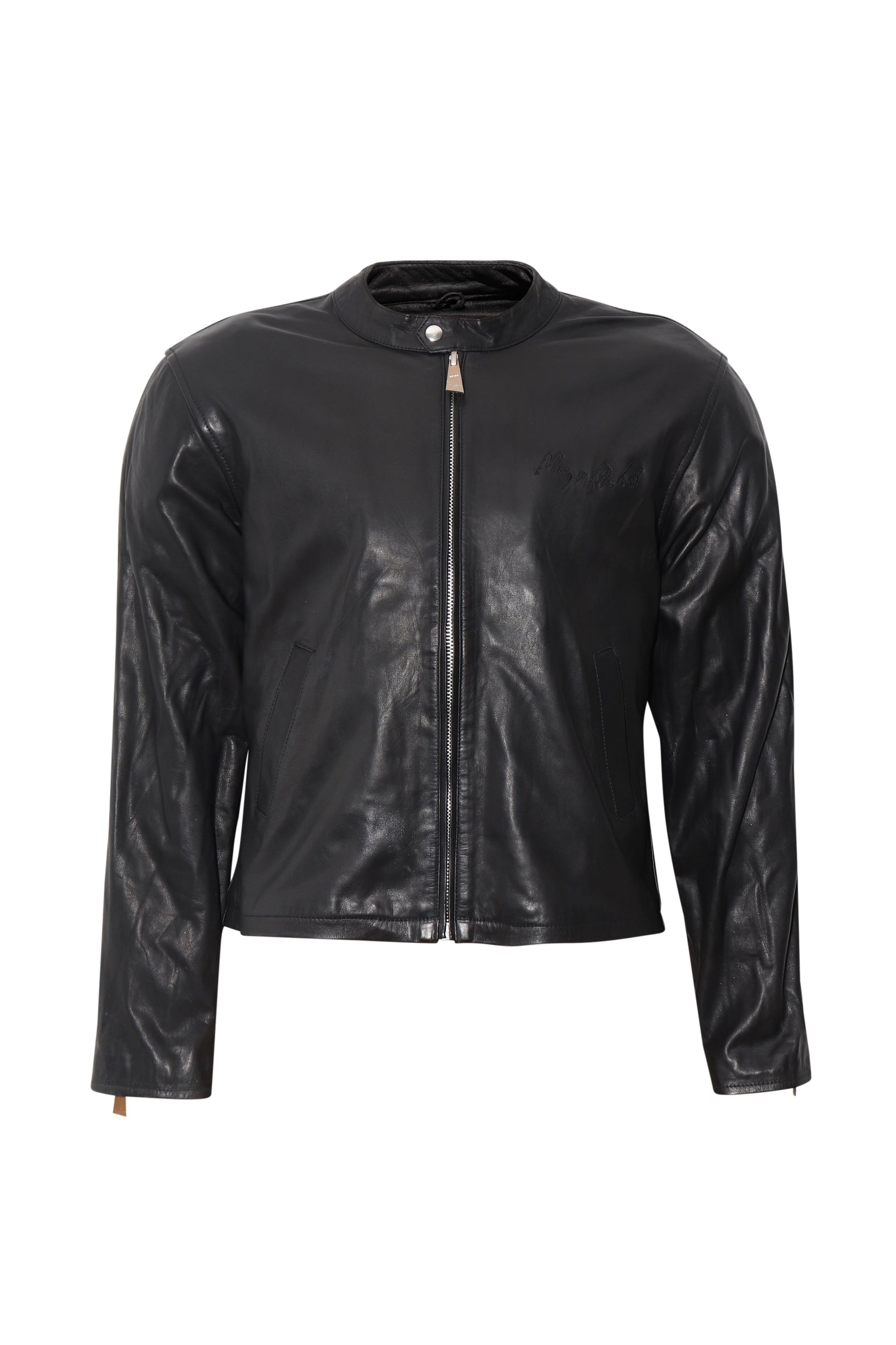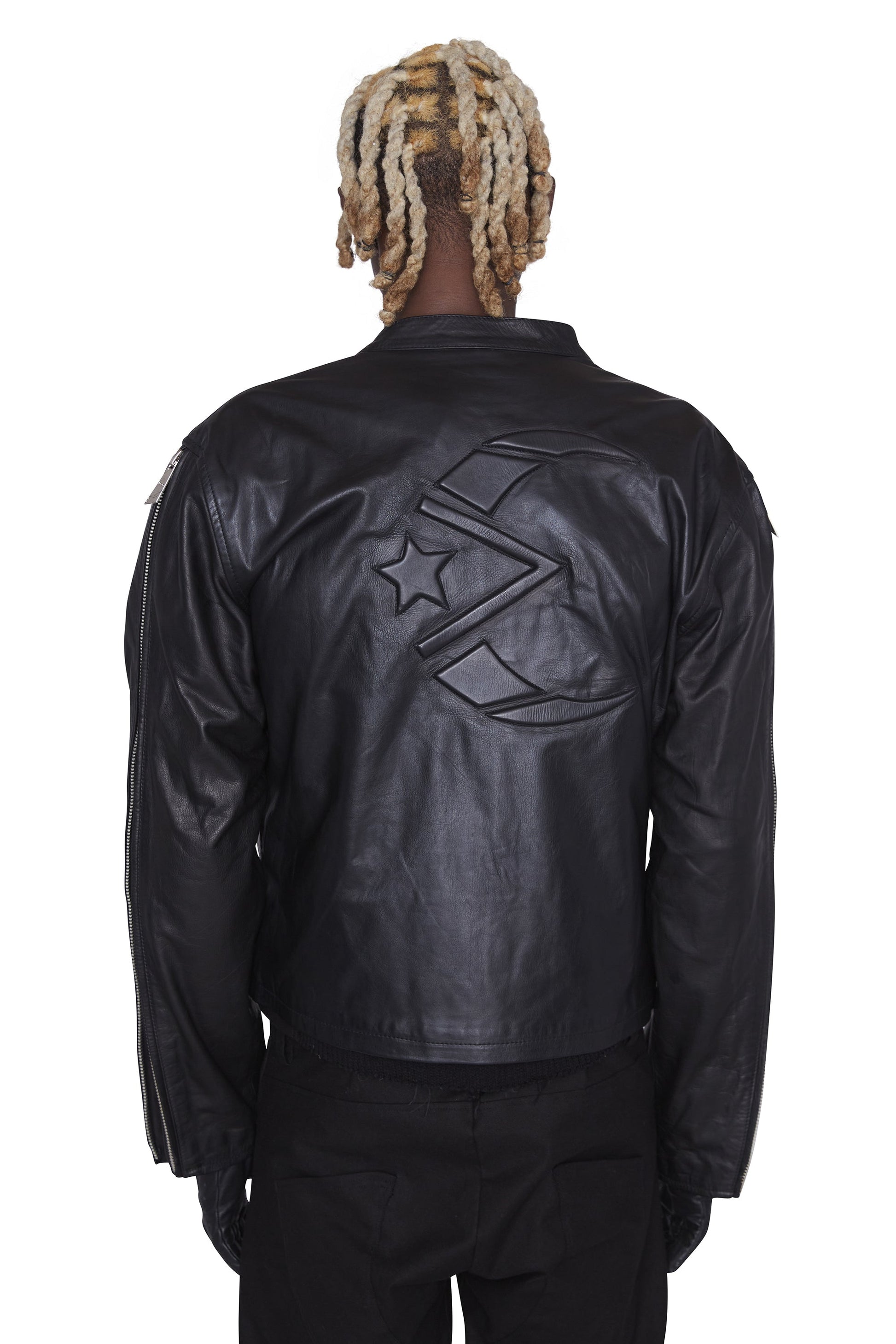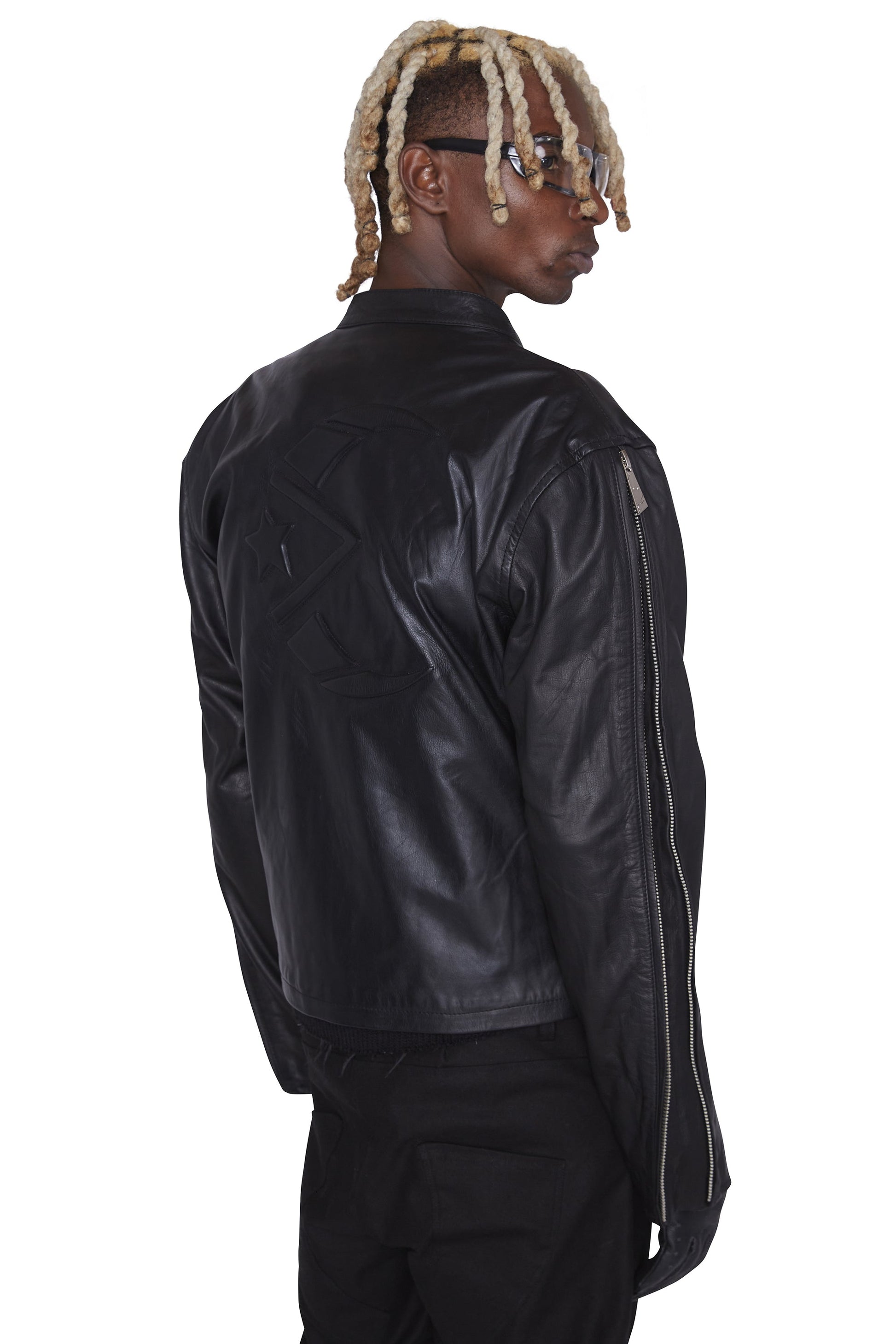 X: Jacke aus Rindsleder mit geprägtem Halbmond-Logo auf der Rückseite, abnehmbaren Schulterpolstern, durchgehendem Reißverschluss an den Ärmeln, der den Blick auf einen Zwickeleinsatz und ein Stickdetail auf der linken Brust freigibt, sowie zwei Vordertaschen.