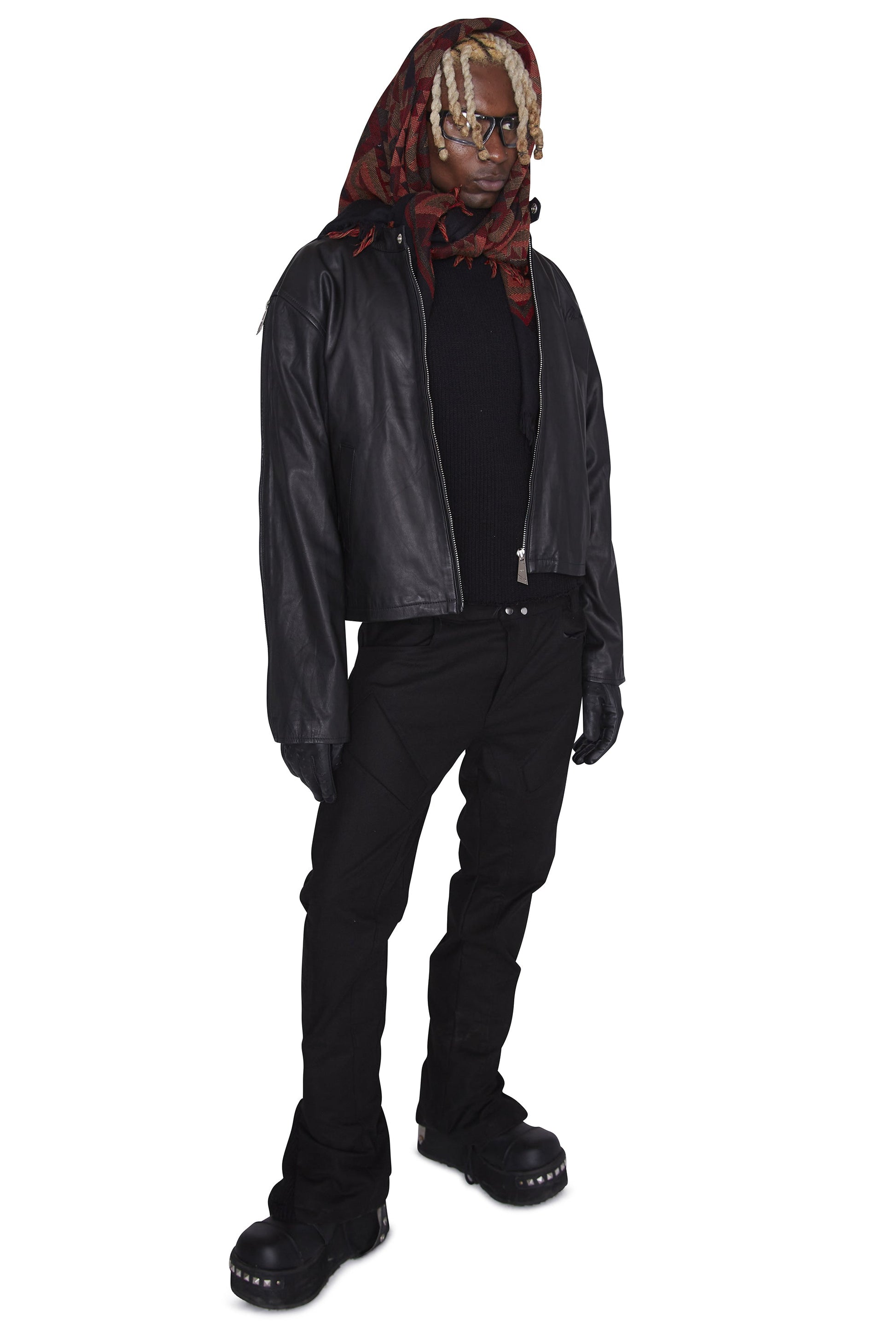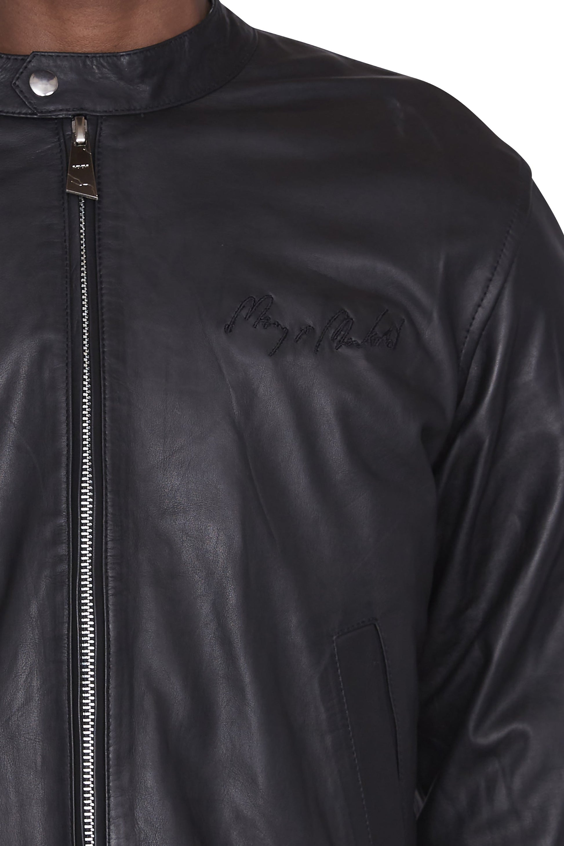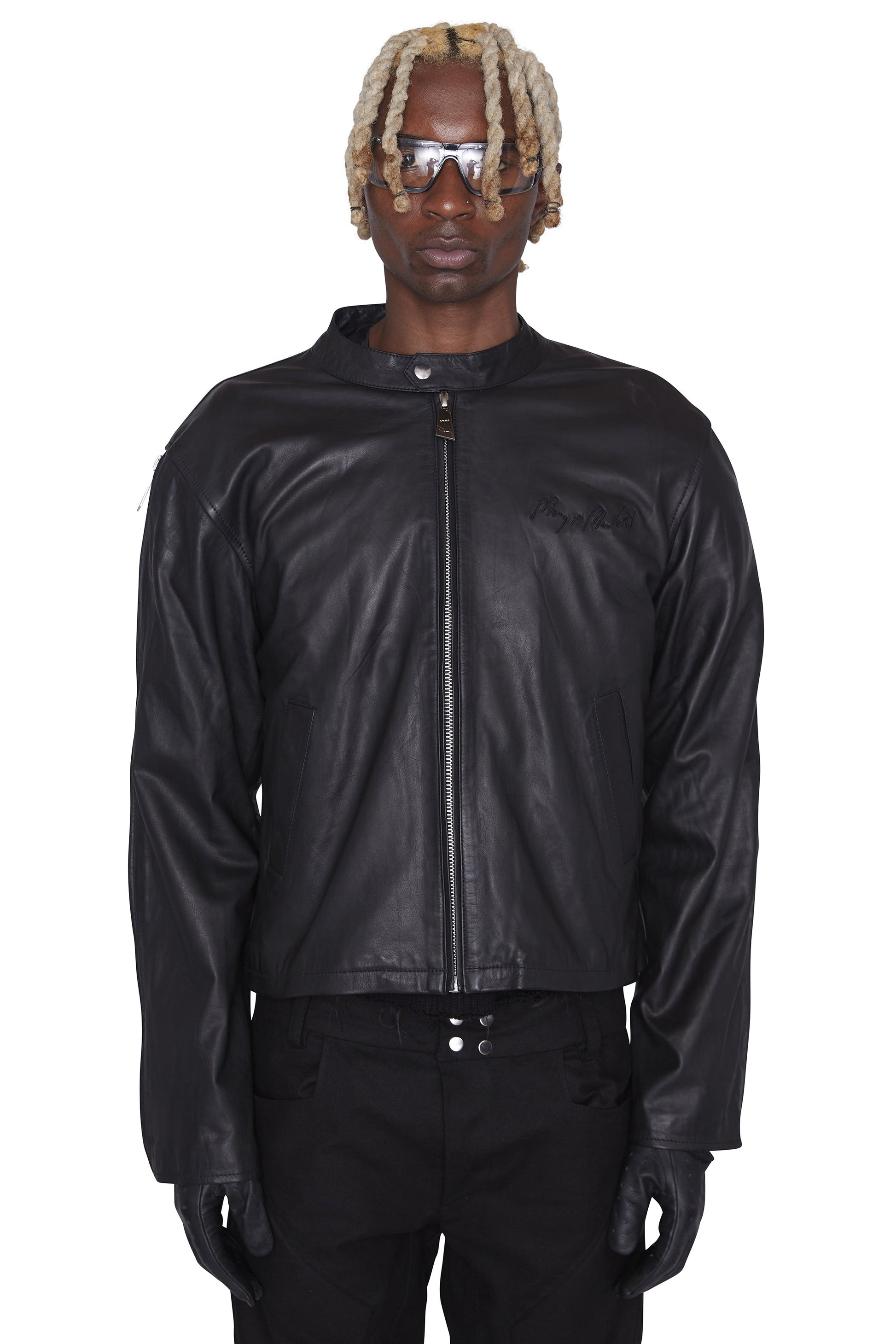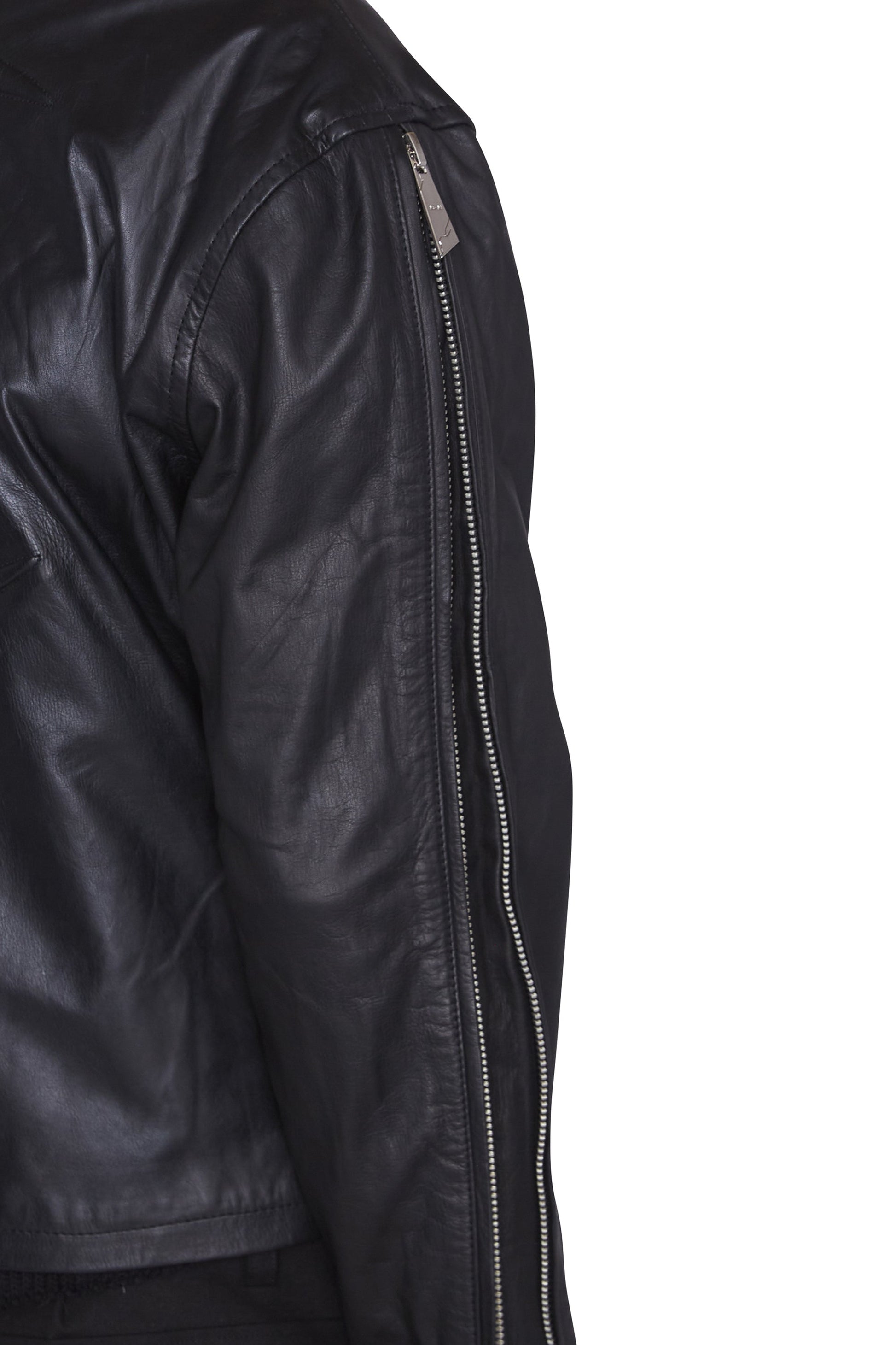 X: Jacke aus Rindsleder mit geprägtem Halbmond-Logo auf der Rückseite, abnehmbaren Schulterpolstern, durchgehendem Reißverschluss an den Ärmeln, der den Blick auf einen Zwickeleinsatz und ein Stickdetail auf der linken Brust freigibt, sowie zwei Vordertaschen.