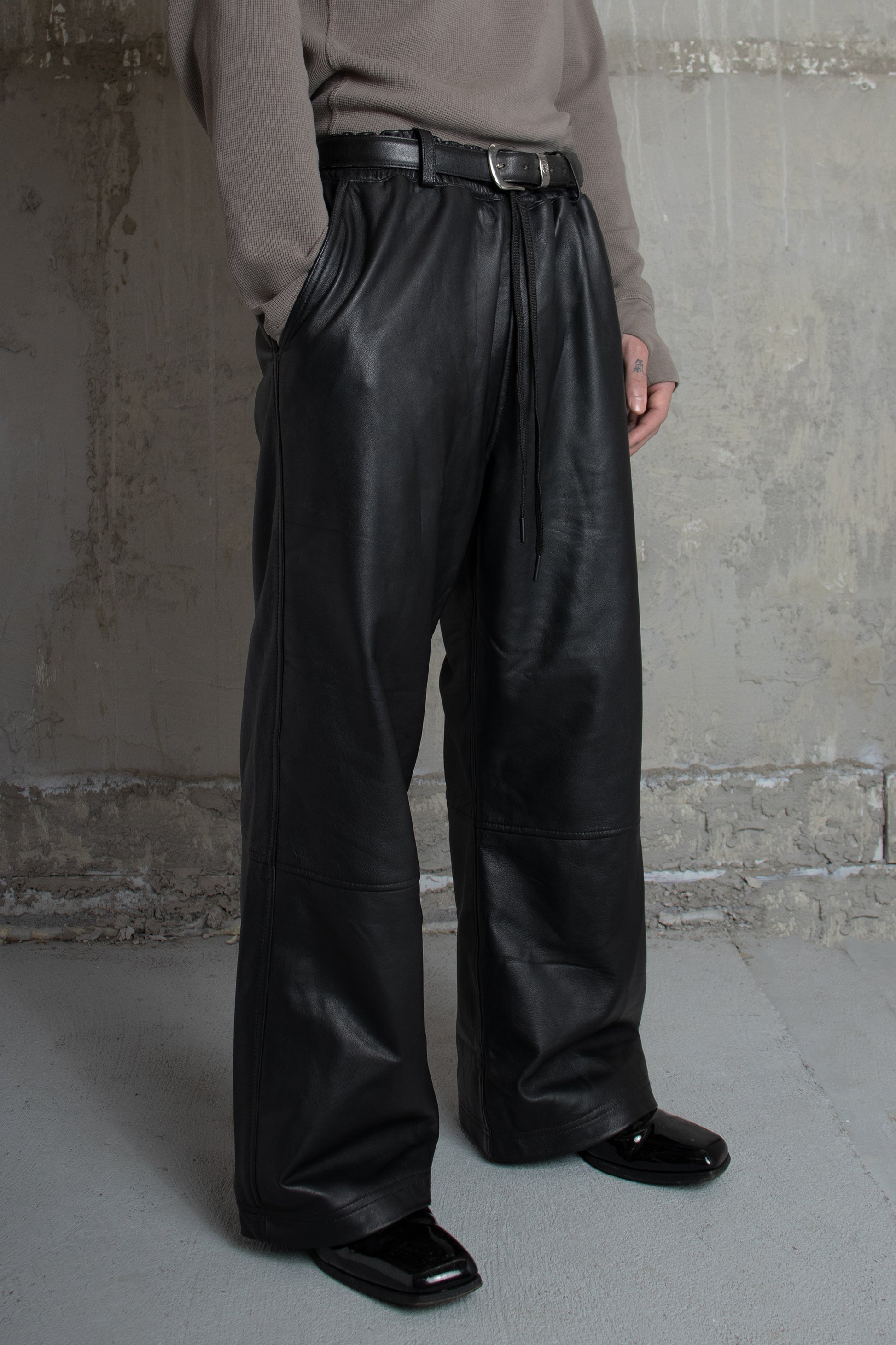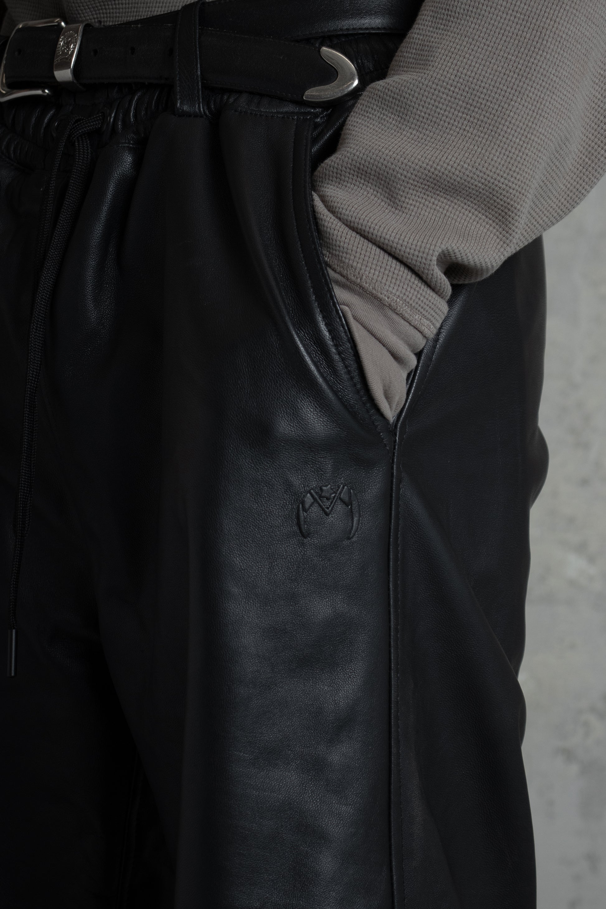 The "Genesis" Leather Sweatpant represents the first chapter in a new language of comfort and structure — a meditation on origin and transformation. Crafted in supple Nappa leather, its silhouette redefines the sweatpant archetype with a flared leg opening, functional belt loops, and a drawstring waist that bridges discipline with ease.
